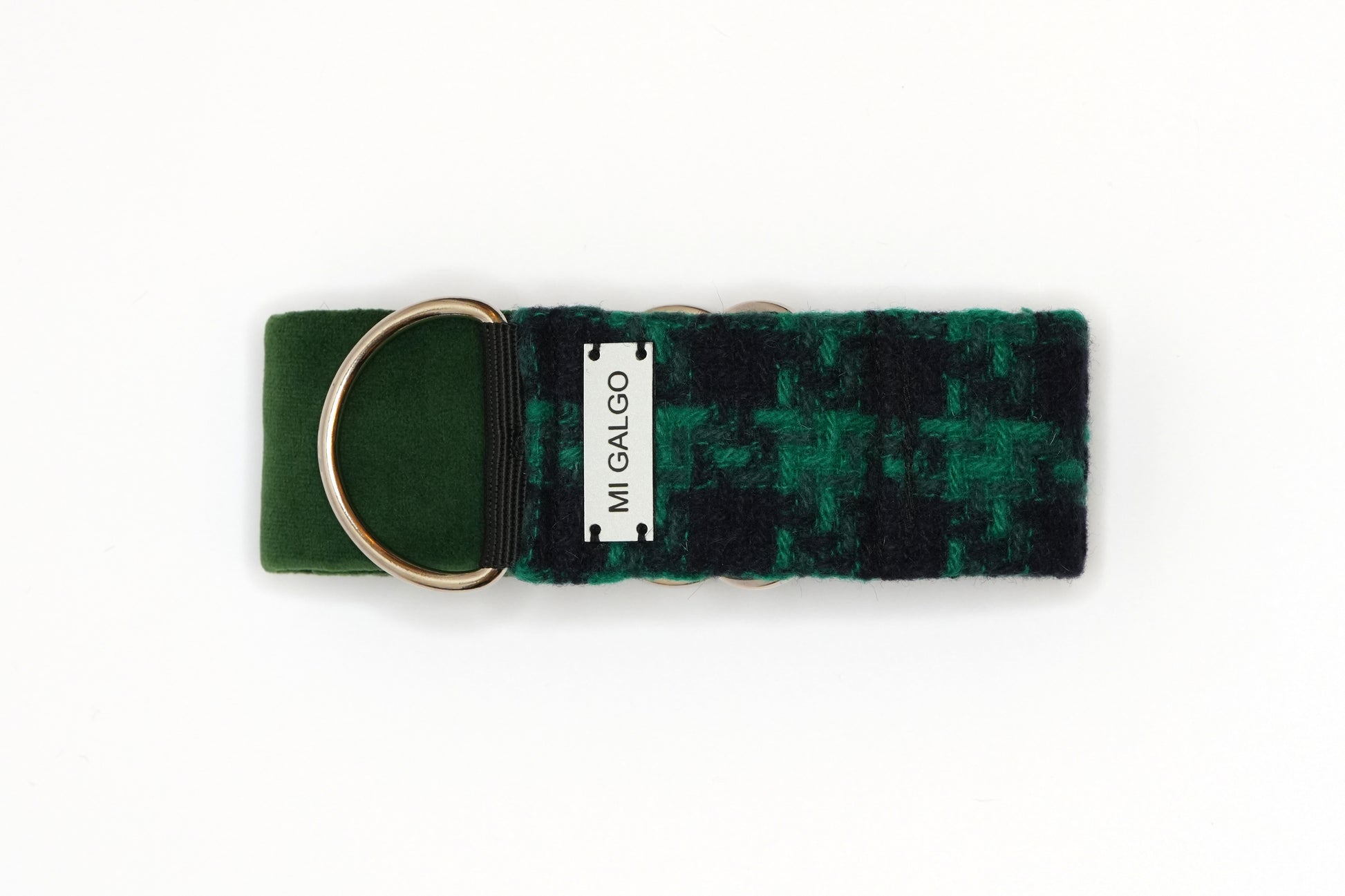 This collar combines earth moss green velour with a bold green and black wool tweed in a houndstooth pattern. The raised textured dots add depth and character, while the rich velour backing provides a soft, comfortable fit around the neck. Paired with nickel-plated hardware, the result is grounded, structured, and quietly distinctive.