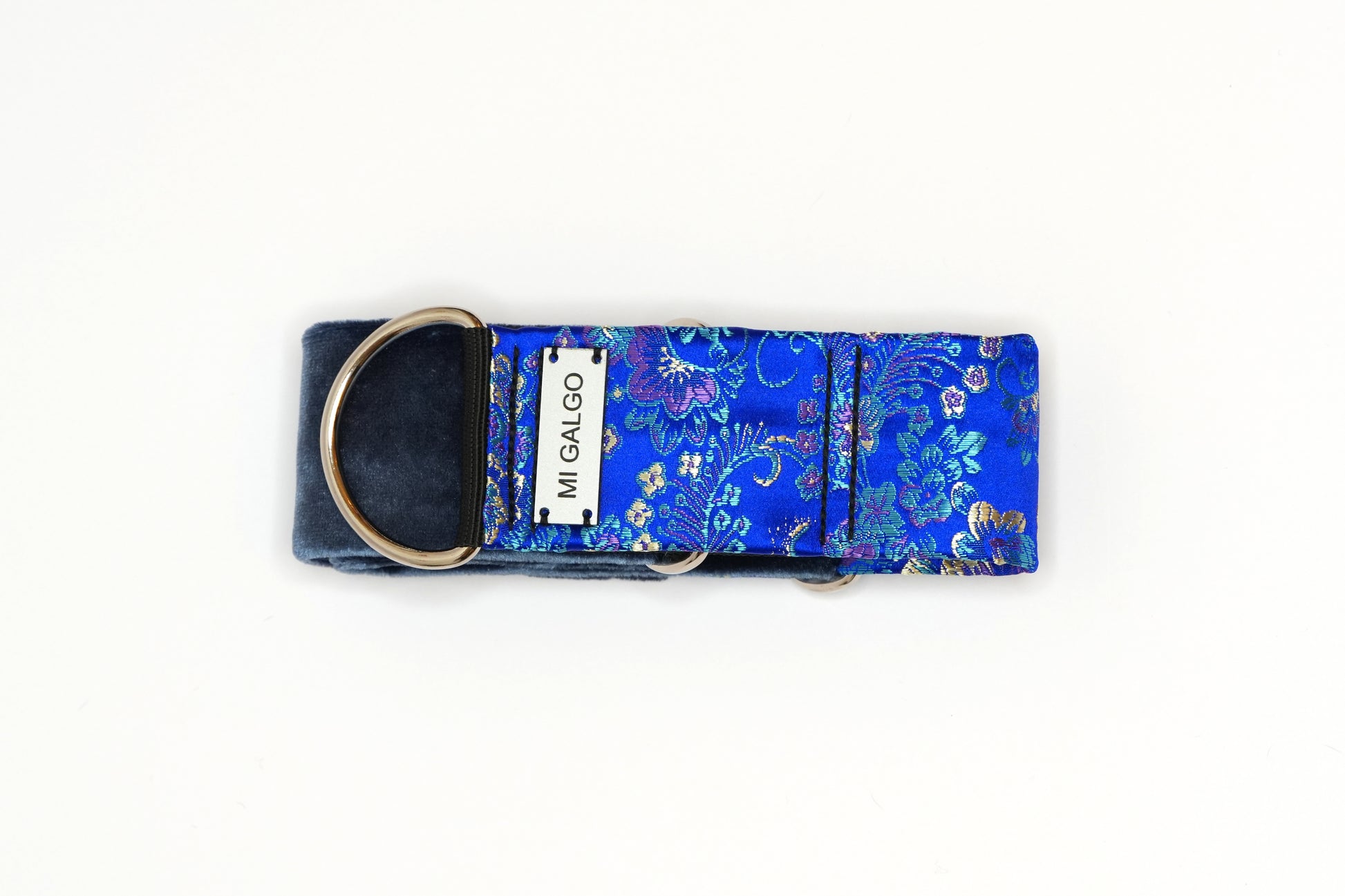 The Royal Sapphire combines deep sapphire blue brocade with intricate floral patterning and a soft grey velour backing. The raised woven texture catches light subtly, while the gold-toned rings add structure and contrast. It feels refined, composed, and intentional - made for city walks and special moments, not for trend chasing.